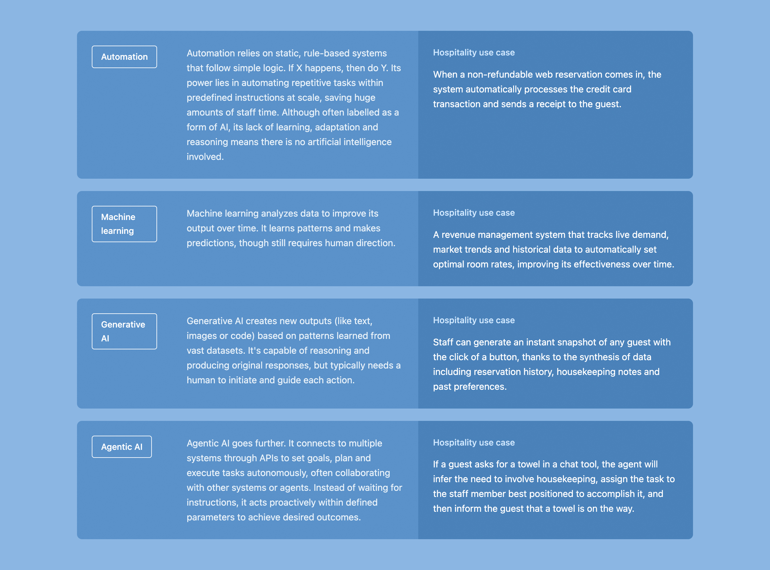 That’s changing. Powerful forces like structural labor shortages, rising costs, shifting guest expectations, and the rapid maturity of AI tooling collide with the old ways of working. Generative AI and machine learning – tools that once sounded abstract – are being embedded into core platforms. And agentic AI is knocking on the door, looking to orchestrate tasks across revenue, operations, and the guest journey in real time.